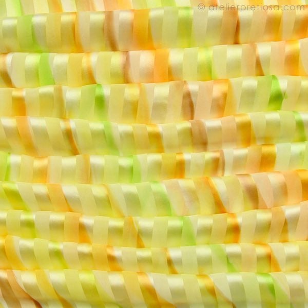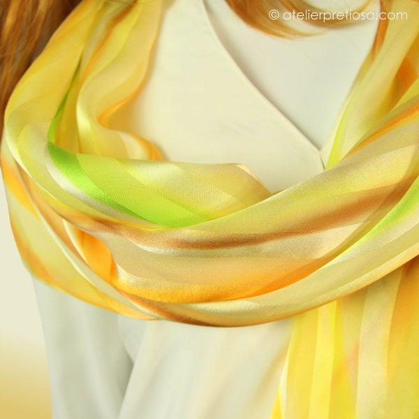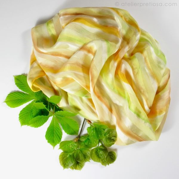 Een zijden sjaal die de stralen al in zich heeft, nodigt uit om met de lentekleuren te experimenteren. Het jonge groen van bladeren die zich ontvouwen, het lichte bruin van nieuw hout en het warme geel dat alles betovert.....